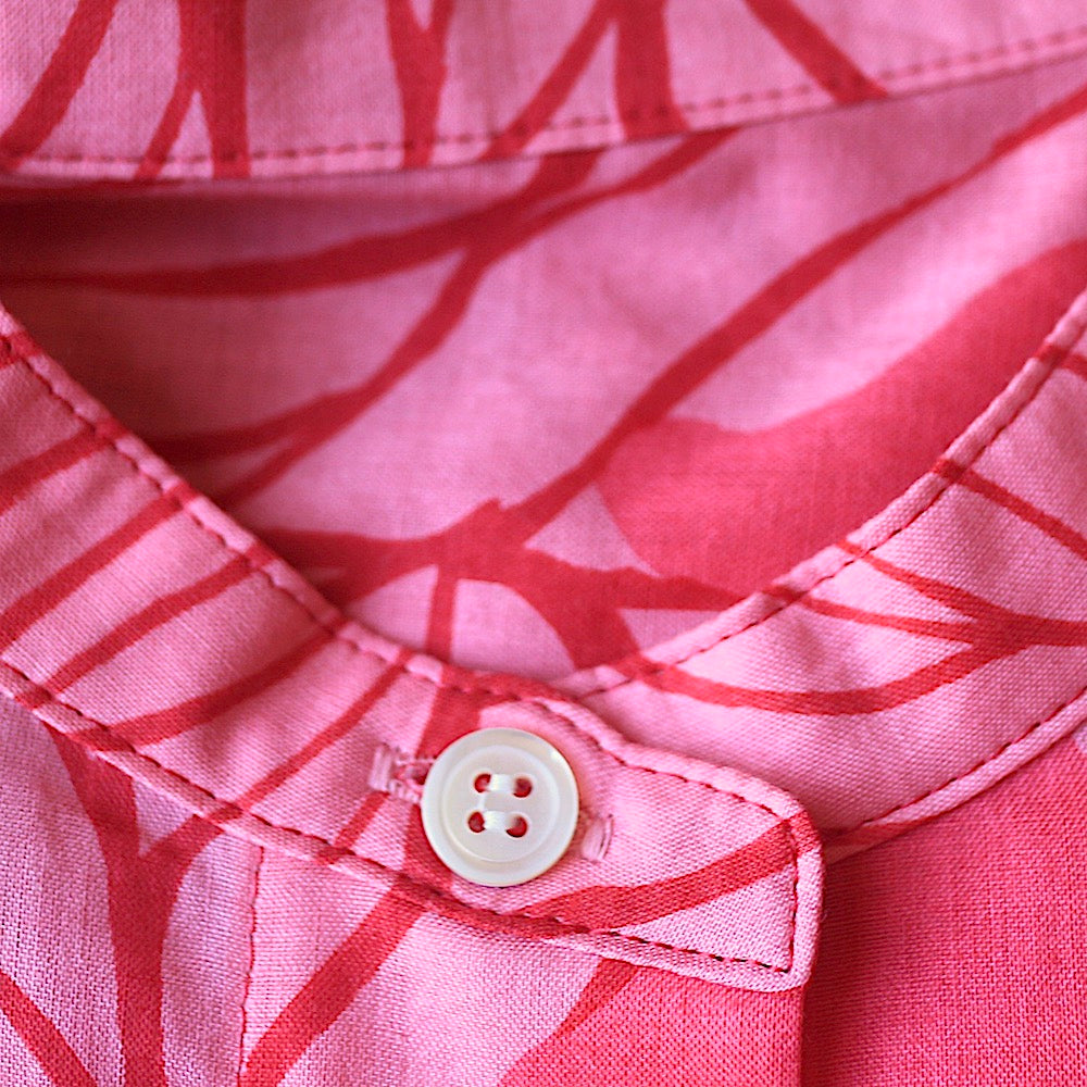 一番下だけ横向きに付けたボタンが、腰まわりをさりげなく締め、流れをきれいに見せてくれます。