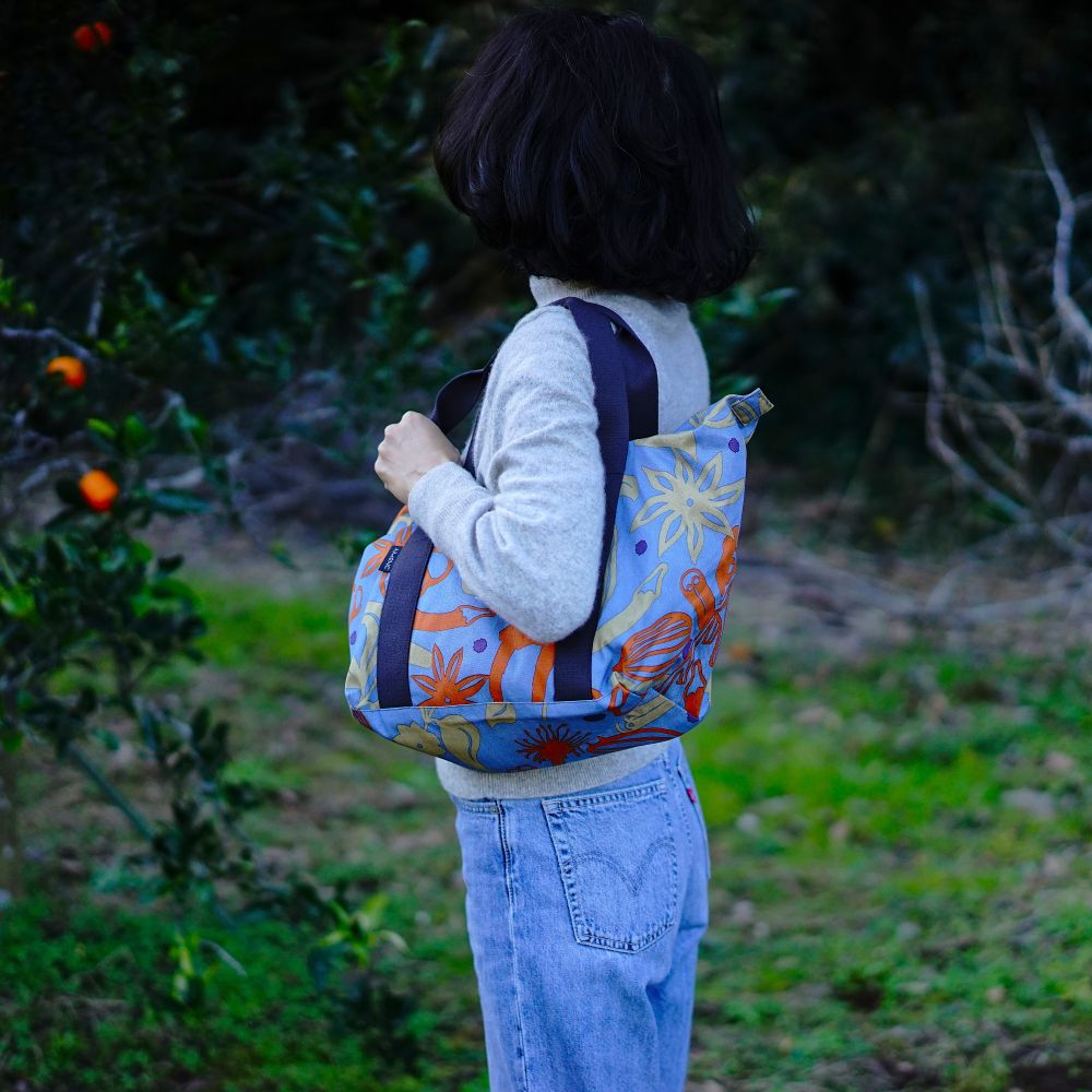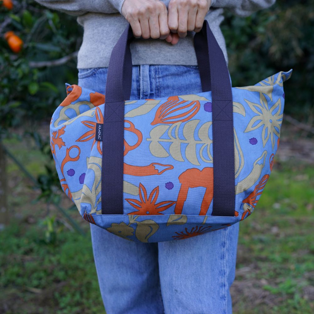 スパイス柄のボストンバッグです。ハリのあるやや薄手の帆布生地なので、なんといっても軽い!くしゃっとしたシルエットが肩の力の抜けたこなれた雰囲気を作ってくれます。
