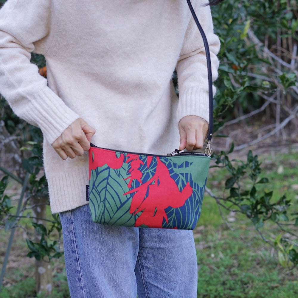 バッグの半分にレッド、半分にグリーン系の生地が使われているミニショルダーです。レッド系もグリーン系も両方楽しめる欲張りバッグ!差し色にも効果的で見ているだけで元気が湧いてきます。明るいカラーリングはギフトにもおすすめ!