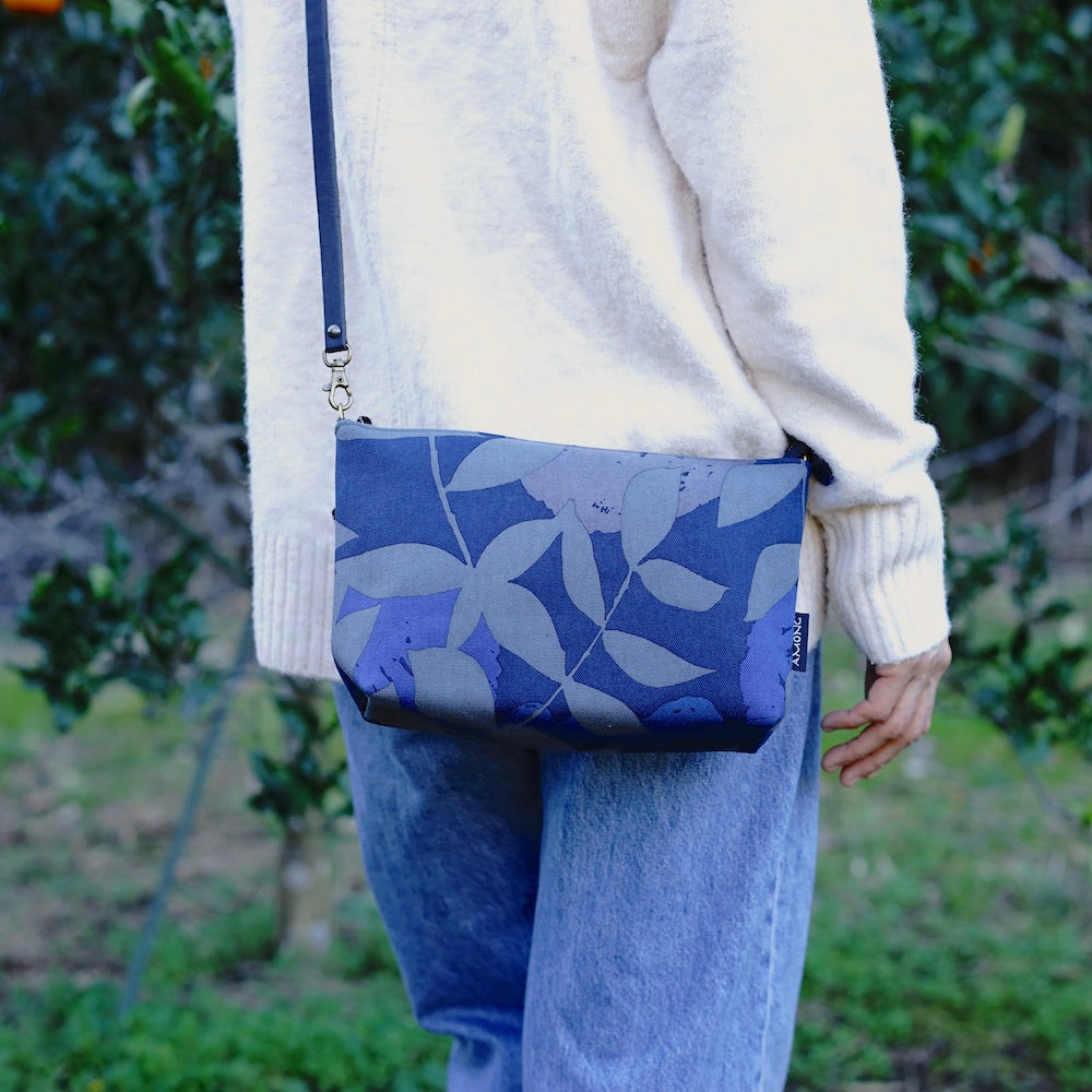 カラーは夜空をイメージしたミッドナイトブルーと絶妙なグレー!明るさのあるブルーから深いブルーが重なる様は、美しい夜空そのもの。葉っぱの重なりから空を見上げたテキスタイルです。