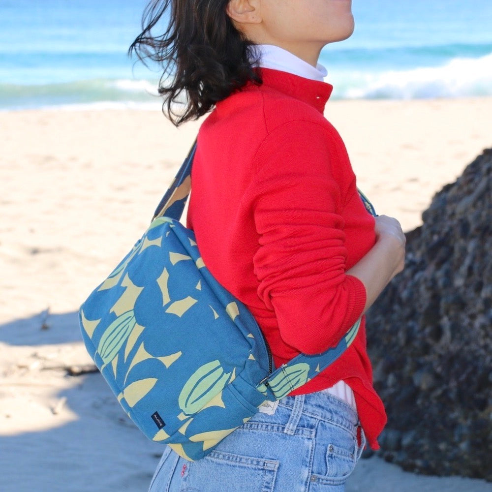 横浜の伝統技術である捺染(なっせん)製法を使って型染めをしたオリジナルテキスタイルを使い、職人の手によって一点ずつ手縫いで縫製しています。